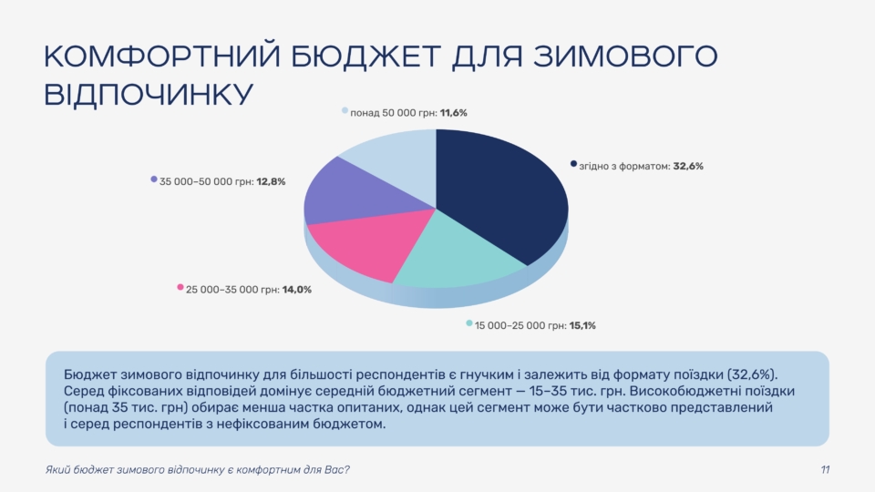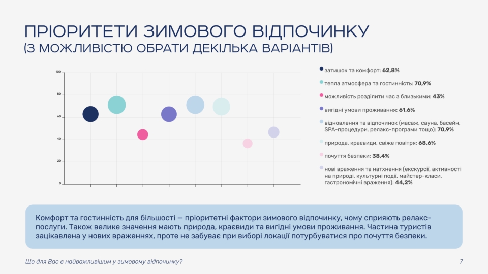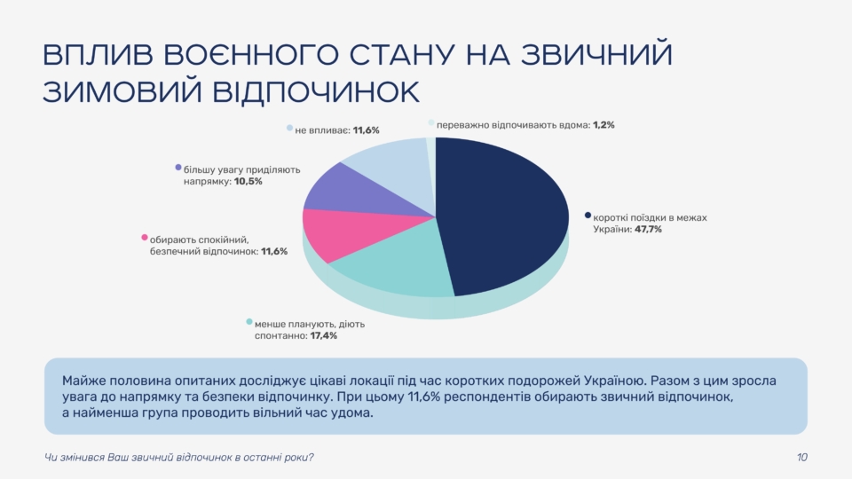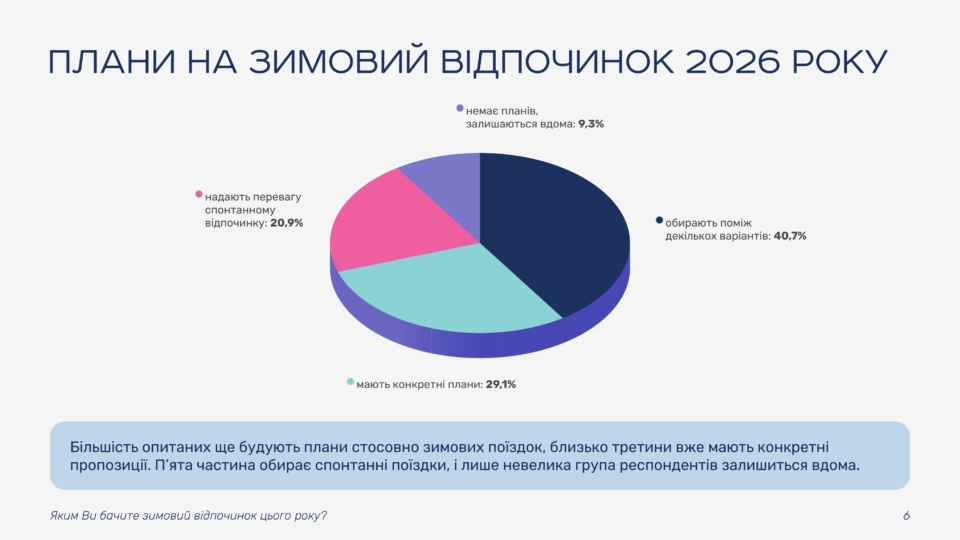 The study shows that most Ukrainians view winter vacations as an opportunity to change their environment and recharge. Some guests already have specific plans, while others are choosing between several options or leaving room for spontaneous trips. Only a small share of respondents do not plan to travel and intend to stay at home.