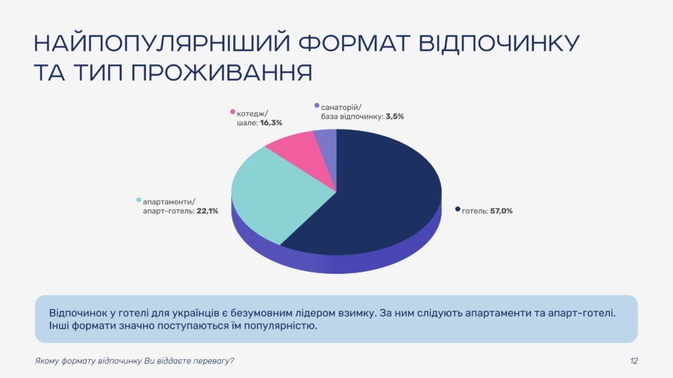 In terms of destinations, mountain and nature-based locations continue to lead. Travel within Ukraine remains the key format of the winter season, supporting the development of domestic tourism.