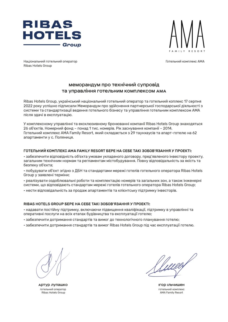 супровід на всіх етапах проєктування та реалізації, запуск готеля, операційне та стратегічне управління