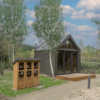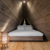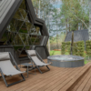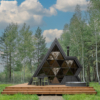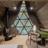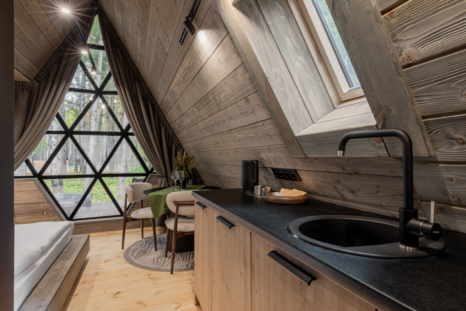 Будиночки A-frame гармонійно інтегровані в ліс.