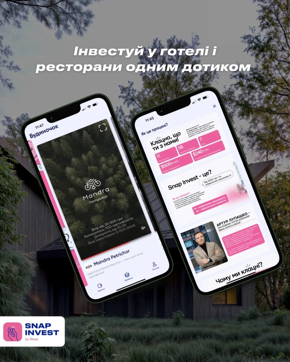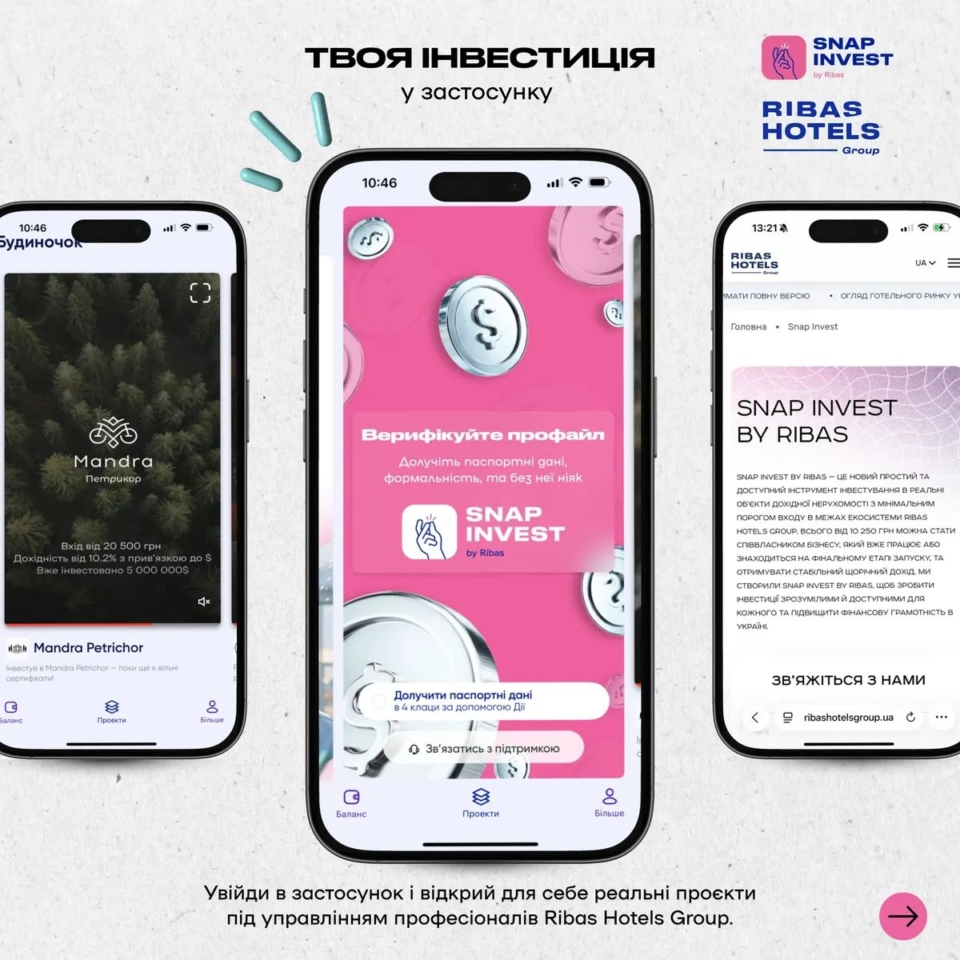 Snap Invest by Ribas — это новый простой и доступный инструмент инвестирования в реальные объекты доходной недвижимости с минимальным порогом входа в рамках экосистемы Ribas Hotels Group. Всего от 10 250 грн можно стать совладельцем бизнеса, который уже работает или находится на финальном этапе запуска, и получать стабильный ежегодный доход. Мы создали Snap Invest by Ribas, чтобы сделать инвестиции понятными и доступными для каждого и повысить финансовую грамотность в Украине.